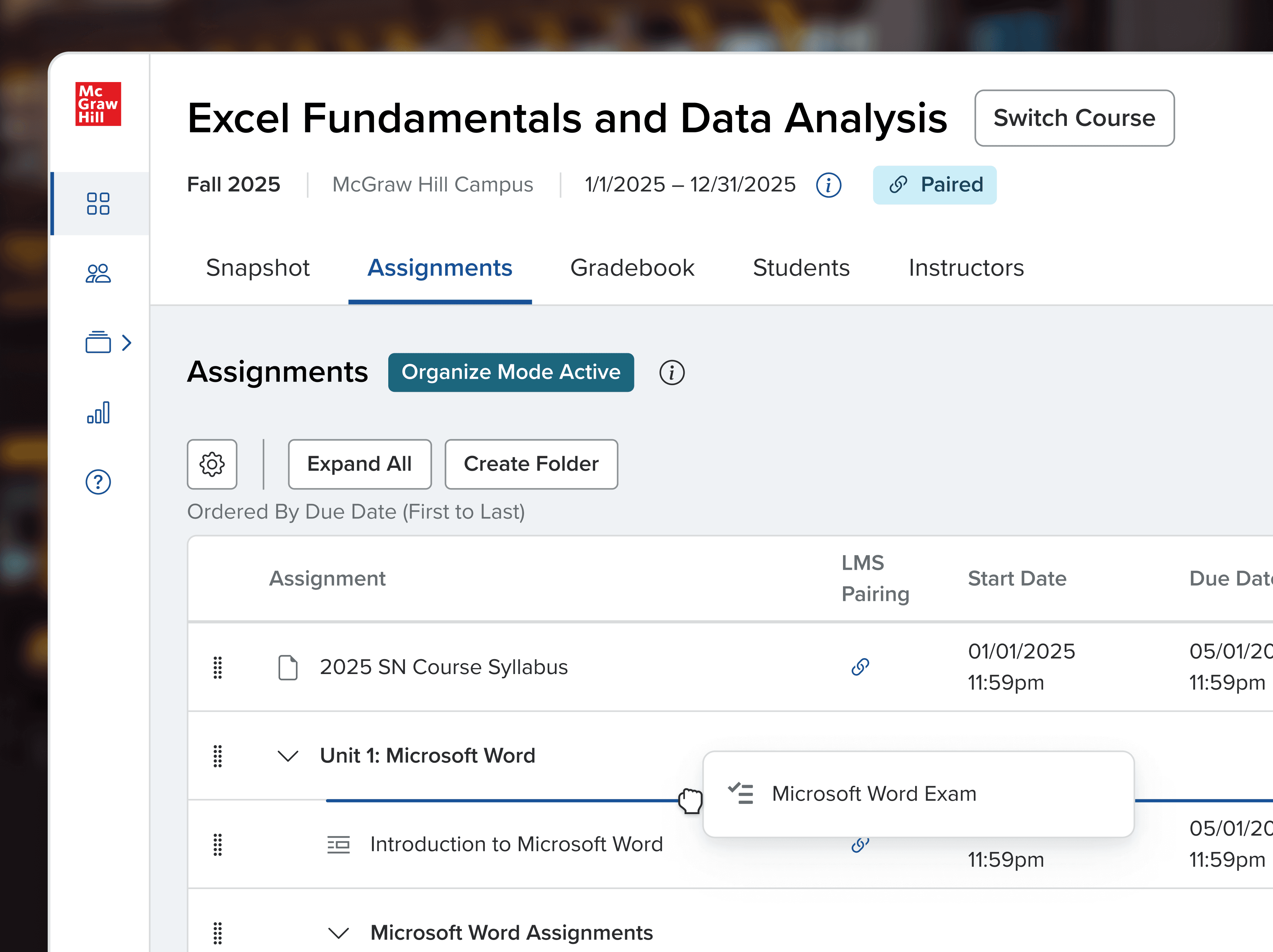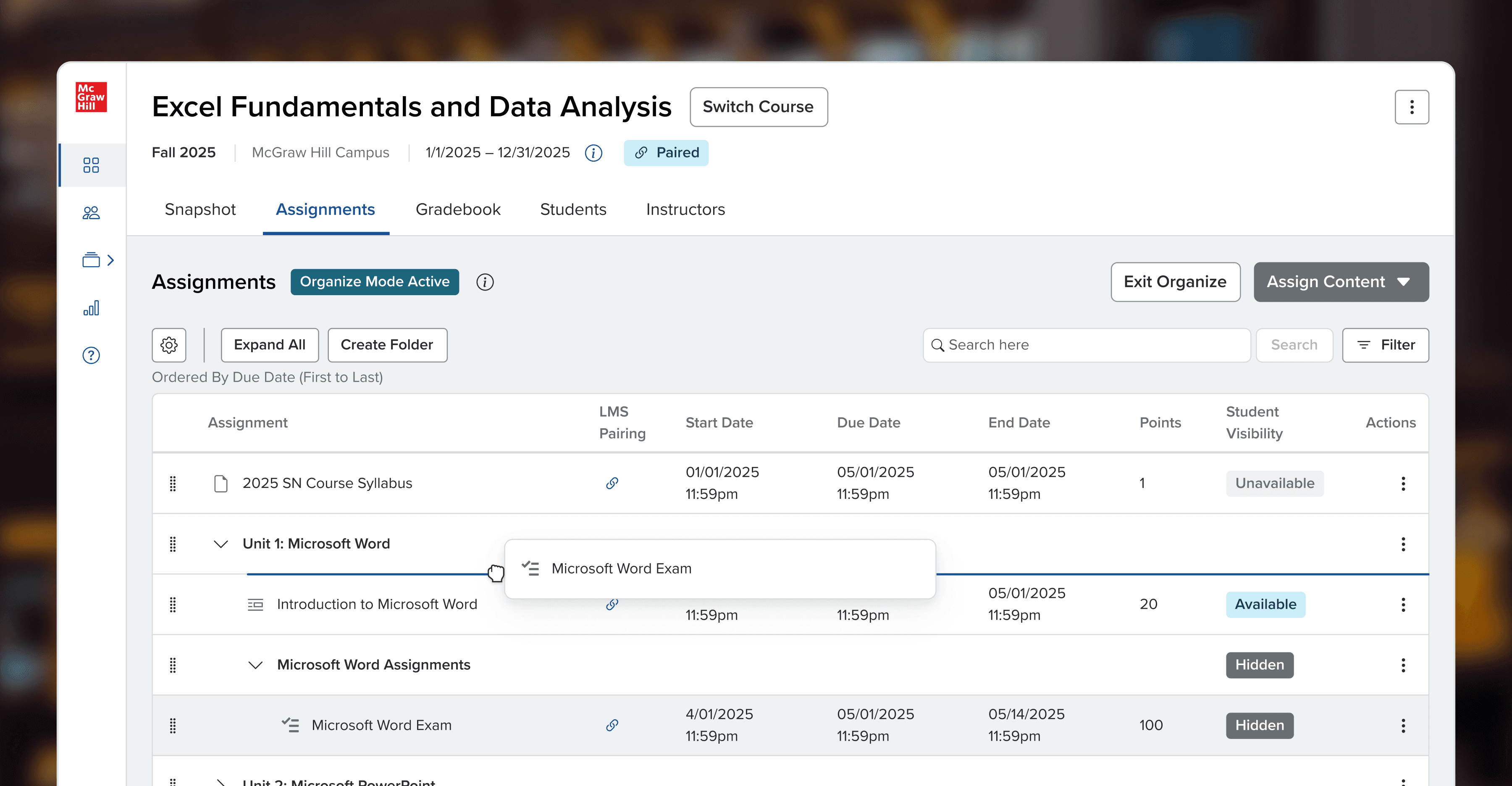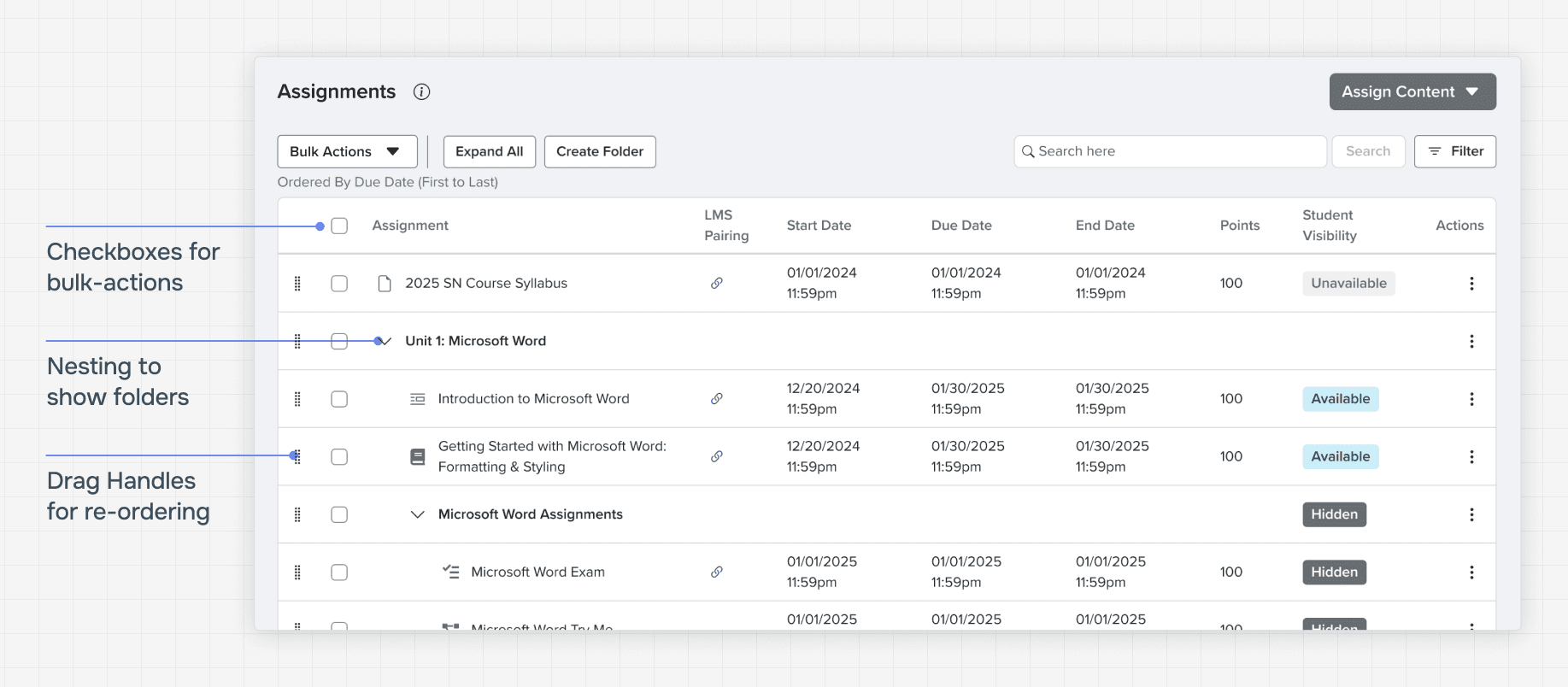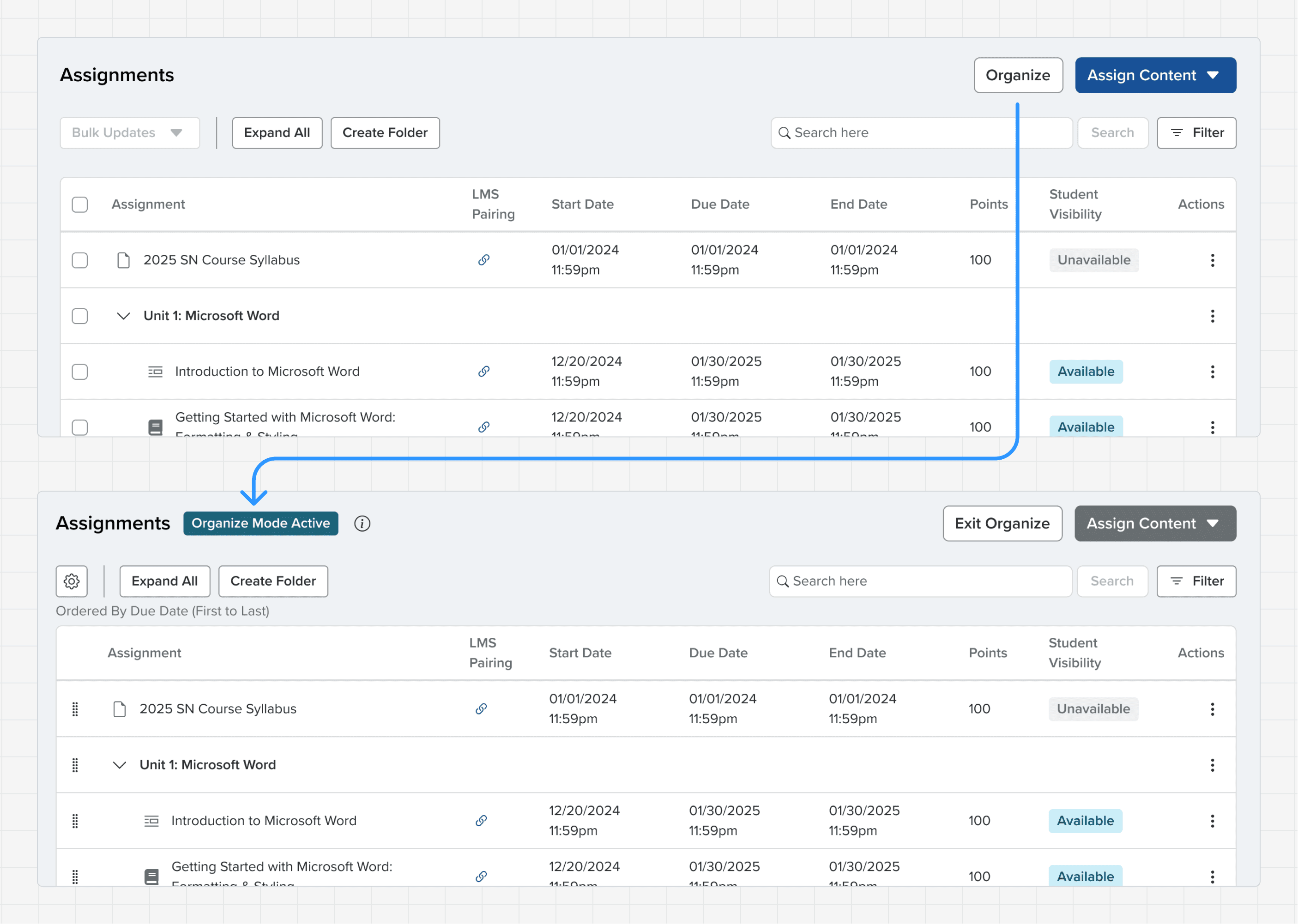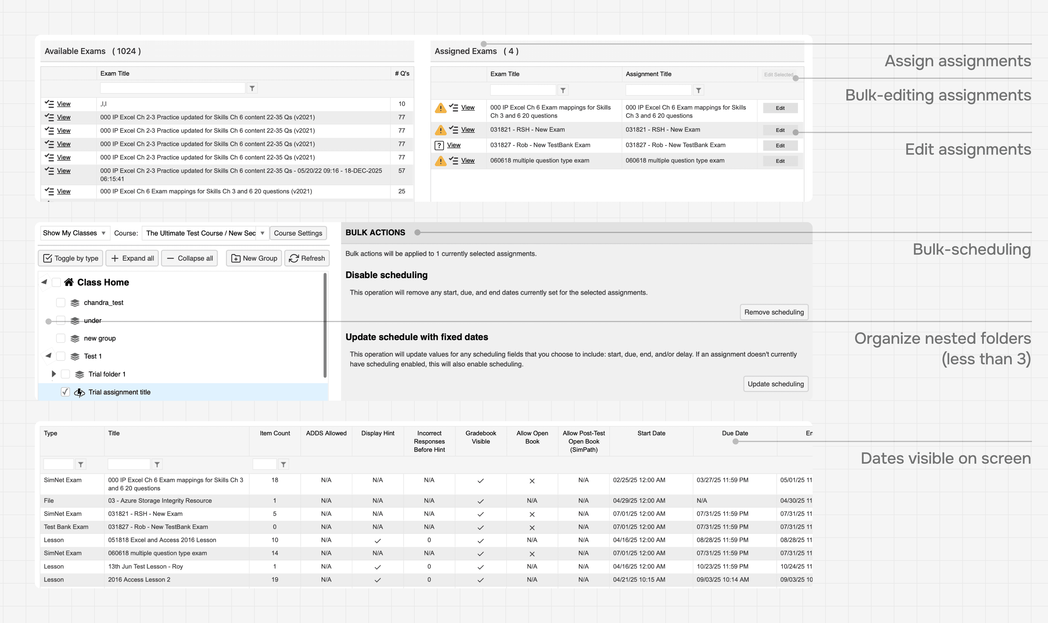 An instructor task here includes updating due dates all at once, re-ordering assignments, and scheduling pop quizzes.*