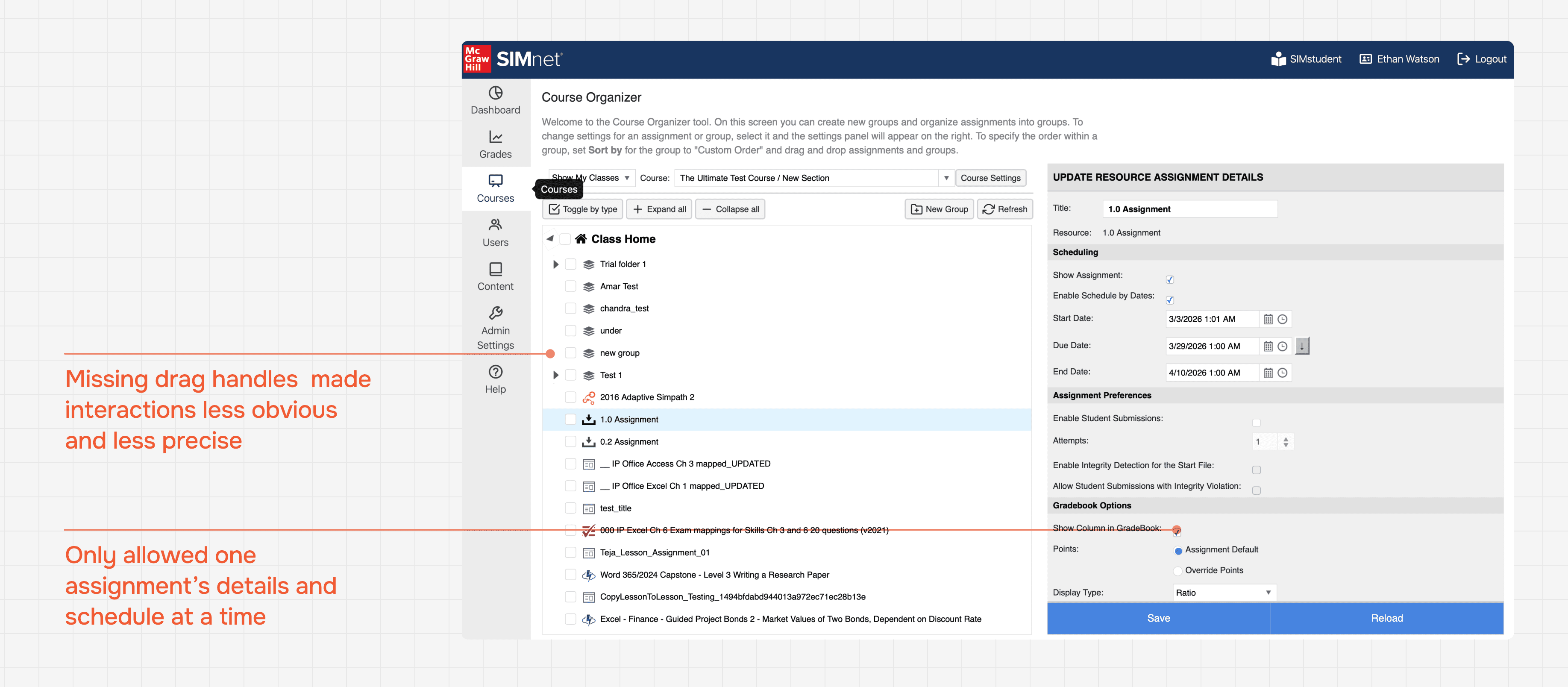 I was convinced that for assignment organizing, instructors would want everything in one workspace, like modern productivity tools. However, a few stakeholders suspected it would be overwhelming for instructors, and rapid validation prototype testing validated their concerns.